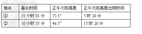 5、单选题 下表是6 月22 日两地昼长时间、正午太阳高度及正午太阳高度出现的时间(国际标准时),据此回答1-2 题。