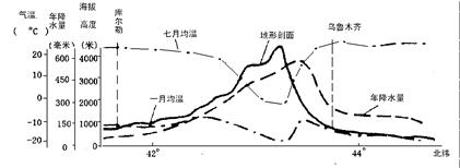 1.图示地形区7月均温最小值出现的海拔高度是2.图示地形区海拔2000米高度上,降水较多的山坡是3.上题所述地区山坡降水按成因应属于4.上题所述地区山坡降水水汽来源于5.库尔勒香梨因独特品质誉满全国,下列是造成其品质优良的因素是