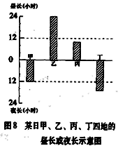 小题3:东八区的中央经线为120°E,乙地经度为20°W或160°E。两地地方时相差9小时20分或2小时40分,甲地日出地方时为6:00,则乙地地方时可能为20:40或8:40。所以本题选择B选项。