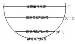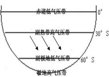 (3)题中所指为近地面的风,受水平气压梯度力、地转偏向力和摩擦力的共同作用,风向与等压线斜交。该地为南半球中纬度地区,盛行西风带控制影响,其实际风向为西北风,如下图所示: