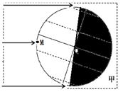 (2)在甲图中用字母M标出直射点、用箭头表示太阳光线(光线画在甲图左侧)、用阴影表示夜半球。(3分)