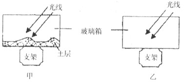 1、单选题  某学校地理兴趣小组做了如下实验:取两个相同规格的玻璃箱(如下图),甲底部放一层土,中午同时把两个玻璃箱放在日光下,15分钟后,同时测玻璃箱里的气温,结果发现底部放土的比没有放土的足足高了2℃。据图回答1~2题。