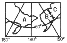 2、单选题 该图为某地区示意图(图中A、B、C为世界三个国家),完成问题。