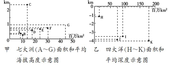 小题1:据四大洋面积排序可知I为大西洋,J为印度洋,分析甲图可知任何两大洲面积之和都不可能和大西洋面积(9000万km2以上)接近,A、C两项排除。只有亚洲(甲图中G)和非洲(甲图中F)两洲面积之和最接近印度洋面积(7000km2以上)。