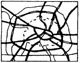 本题解析:分析图中道路交通干线的特点,这是典型的环形放射状的交通网络。这种干线布局主要是为了方便车辆的通行,缓解城市中心交通压力。