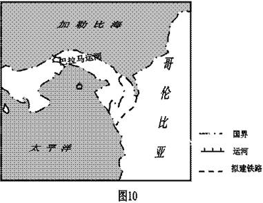 巴拿马运河受宽度和水深限制,目前仅可通航7.6万吨级以下轮船,更大型轮船的货物则需分装、转运。轮船通过运河的时间约9小时。近期,哥伦比亚拟修建一条铁路,长约220千米,预计通过时间为3小时。图10示意巴拿马运河和哥伦比亚拟修建铁路的位置。
