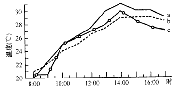5、单选题  下图是对某地的陵园(林地)、操场(裸地)以及足球场(草地)的气温观测结果。图中a、b、c三条曲线分别对应的地点是