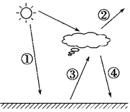小题2:地球变暗是由于大气污染严重,灰尘多,故大气对太阳辐射的反射作用②增强,导致到达地面的太阳辐射减少。
