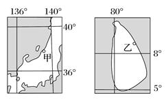 小题1:依据图中经纬度和海陆轮廓可以得出甲所在地为日本的本州岛,乙所在地为斯里兰卡岛,两地冬季降水较多,都是由于冬季风从海洋吹向陆地,受岛屿上的山脉的抬升作用,易形成地形雨,影响因子属于大气环流和下垫面,故答案选B。