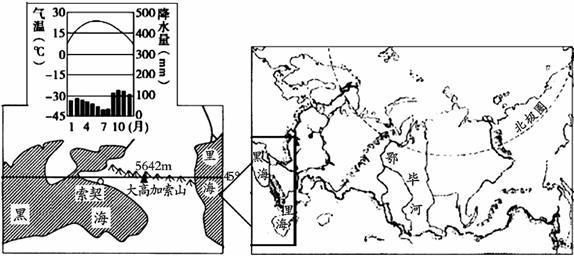 (4)地中海气候;(2分)原因:①濒临黑海,降温慢;(2分)②北部山地(大高加索山脉)(2分)阻挡冷空气南下,冬季气温比同纬度高。(2分)