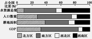 5、单选题 该图是某年我国水资源、人口、耕地和GDP区域比重图。水资源与人口、耕地、GDP匹配较差的区域是( )