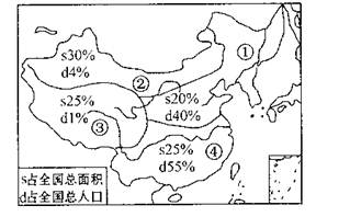 小题2:图示①为北方地区,我国的煤炭、石油资源主要集中于北方地区;③表示青藏高原,为我国光照最强的地区,且多大江大河的源头,河流流量较大,且落差大,故水能资源丰富。②区西北干旱、半干旱地区,大多位于非季风区降水稀少、气候干旱,该区石油资源主要位于新疆一带。④区为我国南方地区,位于我国亚热带、热带季风区降水多、水资源丰富,有色金属资源丰富。但陆上石油资源欠缺。故选B项。