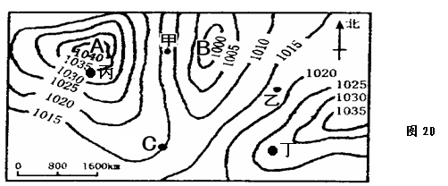 1、综合题 图20示意北半球某地区1月海平面等压线分布(单位:hpa),读图回答问题。(13分)