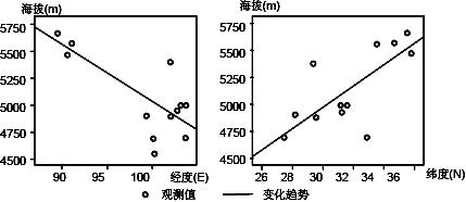4、单选题  下图示意长江上游地区雪线高度的经向和纬向变化趋势。该地区雪线高度变化的趋势
