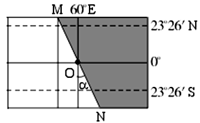 【小题1】图中MN这条昼夜半球的界限为昏线,则昏线与赤道交点所在经线即60E经线为18:00,则45E经线为17:00,又因为M点在昏线上,所以17:00即为M 所在纬线的日落时刻,(日落-12)X2即为昼长时数。所以A正确。