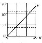 2、单选题 2014年11月5日至11日,亚太经合组织(APEC)领导人会议在北京举行,会议期间北京空气质量均为优良级别,网友将这样的蓝天称为“APEC蓝”。下图为APEC会议期间某日局部区域光照图,MN为晨昏线的一部分,M点为晨昏线与某纬线的切点。回答下列各题。