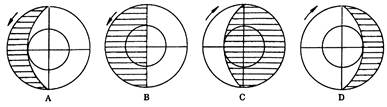 4、单选题 下列四幅图中,反映北半球冬至日的是(图中阴影部分表示黑夜,外圆是赤道,内圆是极圈)( )