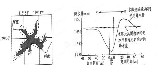 5、单选题 某水库形状呈树枝型,水库的流域面积为l0480平方千米,水库面积达580平方千米,下面左图中实线表示正常水位轮廓线,(海拔101.6米),虚线表示某次持续降雨后的水位轮廓线(海拔102.2米);下面右图为水库对周围地区降水影响比较示意图。读图完成7-9题。