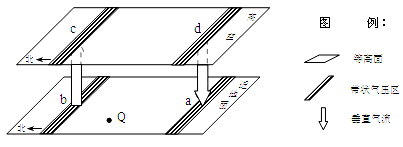 【小题2】若图示地区在北半球。理论上,c、d之间的稳定水平气流方向(风向)为 ( )