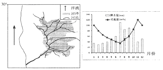 3、单选题 下图为世界某地区某水系分布图和甲地月平均径流量曲线、降水量柱状示意图,读图回答下列各题。