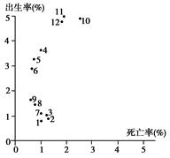 3、单选题 读不同国家出生率、死亡率统计图 (图中1~12代表国家),回答题。