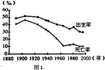 2、单选题 图1为某国人口出生率和死亡率统计图,读图回答问题。