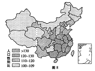 3、单选题 图8为“我国2000年人口出生性别比分布图”(人口出生性别比是指每出生l00个女孩所对应的男孩数)。读图完成下题。
