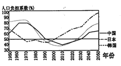 材料一:中国、日本和韩国人口负担系数百年比较图,当人口负担系数≤50%称为“人口机会窗口”期。(*注:人口负担系数=[(14岁及以下人口数+65岁及以上人口数)/(15~64岁人口数)]×100%)。