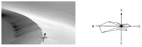 材料 洛杉矶及周边地区晴天较多,海滩、沙漠等多样的景观为电影拍摄提供了良好的自然条件。左图是该地区盛行风作用下形成的某一新月形沙丘局部图,右图是沙丘所在地风频图。
