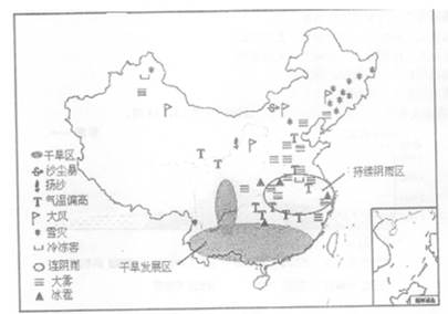 点评:本题以我国不同区域自然灾害分布为背景考查区域环境特征,难度一般。解答关键是明确图示自然灾害分布状况出现的时间,可根据此时北方多雪灾、大风、沙尘暴推知。然后根据时间结合课本知识推算区域环境特征。