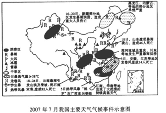 4、综合题 下图为我国2007年7月主要天气气候事件示意图,读图回答问题。