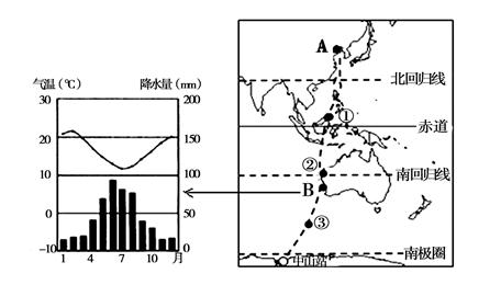 材料 中国第28次南极考察队乘“雪龙”号自2011年11月3日从天津(A)正式出发,11月29日抵达中山站,并于2012年4月8日完成考察任务返回上海港,历时164天,航程3万余海里。图是航行路线,图是澳大利亚弗里曼特尔港码头(B)的气温曲线和降水量柱状图,图是地球公转示意图。