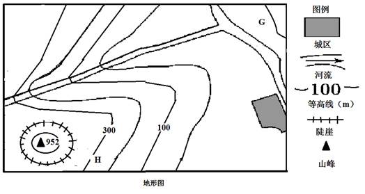 小题1:考查区域分析能力、判读等高线能力。由地形图可以判断此区域地形以丘陵为主,利用等高线判断地形的方法:等高线数值低于200米为平原,低于500米地势起伏小为丘陵,高于500米地势起伏大为山地,高于1000米地势起伏小为高原,中低周高的地形为盆地。结合气候资料统计图可以判断此区域的气候类型为温带季风气候,通过1月的平均气温可以确定是温带季风气候区中位置偏南的区域。典型植被这温带落叶阔叶林,可以种植的水里主要是苹果,水往低处流从图中等高线及城区的位置可以判断出干流区域是北高南低流向为西北向东南,H地和G地之间有山脊,所以在H地无法看到G地。