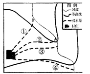 4、单选题 图中数码代表的四条引水线路中,河水最可能自流入村的是