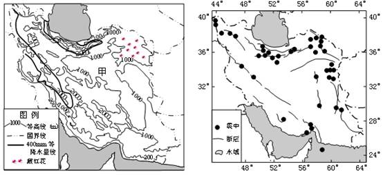 1、综合题 图1为某国等高线地形图,该国生产藏红花约占世界总产量的四分之三,甲指示区域为1000米等高线环绕地区;图2为该国七级及以上地震震中分布示意图。(16分)