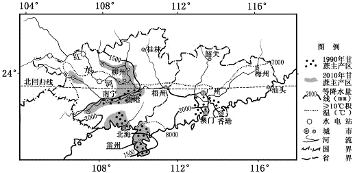 材料一:下表为1990~2010年广东、广西甘蔗生产状况统计表。