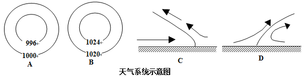 (1)根据天气系统示意图,A图为低压(气旋)系统;B图为高压(反气旋)系统;C图为冷锋天气系统;D图是暖锋天气系统。寒潮是由冷锋天气系统造成的,秋季我国北方出现的“秋高气爽”的天气与高压有关。