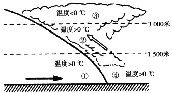 4、单选题 2011年1月3日,受北方冷空气影响,贵州、湖南、广西等地冻雨天气仍在持续。当较强的冷空气南下遇到暖湿气流时,冷空气插在暖空气的下方,近地层气温骤降到0℃以下、湿润的暖空气被抬升,成云致雨。当雨滴从空中落下来时,由于近地面的气温很低,在电线杆、植被及道路表面都会冻结上一层晶莹透亮的薄冰,气象学上把这种天气现象称为冻雨。下图为冻雨形成示意图。结合所学知识回答1~3题。
