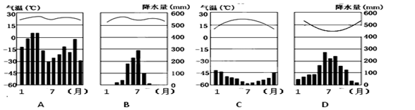 【小题2】若M点位于大陆西岸,下图中表示M地气候特征的是( )