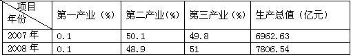 本题解析:1.通过对表格数据的分析判断:该地区第一产业比重没有发生变化,但是生产总值提高,所以第一产业的产值增加;第二产业的比重降低,但是产值提高;该市已由第二产业为主转化为以第三产业为主。所以本题选择B选项。