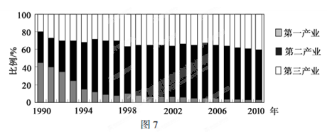 2、单选题 我国东南沿海某市原为农产品和部分轻工业原料生产基地,1990 年开始积极吸引外资,调整产业结构,建立起以化工、机械、纺织、电子、服装等为主的工业体系。下图是该市1990 ~2010 年产业结构变化图。读图回答问题。