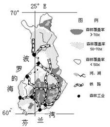 1、单选题  芬兰森林覆盖率高,森林工业历史悠久,是芬兰的支柱产业,下图为芬兰森林覆盖率和森林工业分布简图,读图回答下列各题。