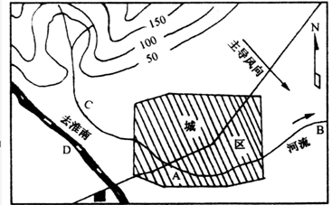 3、综合题 如下图,某城市拟在A、B、C、D四地建火力发电厂、自来水厂、印染厂、服装厂,从经济效益、环境因素考虑,完成下列问题:(12分)