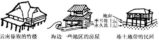 11.上面三种传统建筑都采用了用木桩或水泥柱将房屋架起来的方式,但它们的设计目的是不同的。请结合你所学的地理知识,简要说明这样设计的原因。