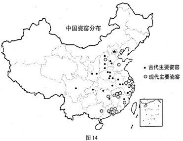 3、综合题 材料一?瓷器是高岭土(矿物)经过加工成型,再经高温烧制而成。图14示意为中国古代与现代陶瓷主要生产地分布。
