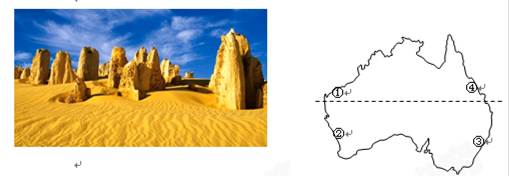 2、单选题 下图为澳大利亚某地临近海岸线的“岩塔荒漠”景观,许多石灰岩塔坐落在漫漫黄沙之中。环顾这片黄沙的周边,却有不少绿色植物。再细细追踪,这片沙地上还发现了硬叶林的古遗迹。据此回答下列各题。