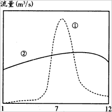 (3)下图为①、②两地水文站测得的河流水量变化曲线, 请说明湖泊对该河流径流的影响。
