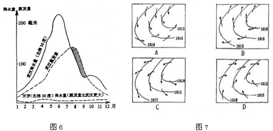 小题2:当武汉正值图6中阴影部分对应的月份时,常受图7中哪种天气系统的影响(?)
