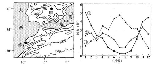 3、单选题 下图为“世界某区域图”,右图是风力统计曲线,其中两条对应左图中甲、乙两地,读图回答题:
