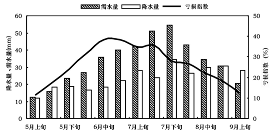我国西北某区域春玉米生长季内需水量、降水量及水分亏损指数。